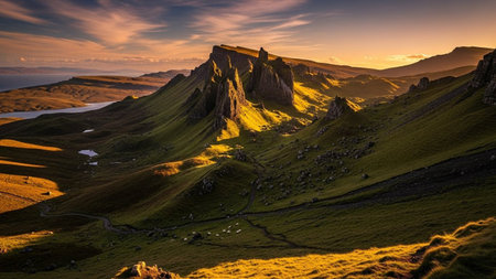 A panoramic view of the Scottish highlands bathed in the warm glow of golden hour sunlight. Jagged, rocky peaks rise dramatically from rolling green hills, casting long shadows across the landscape. A winding path snakes through the valley, and a few sheep graze peacefully. The vast sky above is painted with hues of orange, yellow, and pink from the setting or rising sun, with wispy clouds adding texture. The scene evokes a sense of wild beauty and serene isolation.