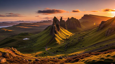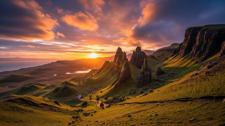 A sunset paints the sky with vibrant hues of orange, yellow, and purple over a dramatic landscape. Jagged, dark rock formations rise from rolling green hills, casting long shadows. The sun's rays pierce through scattered clouds, illuminating the scene and highlighting the textures of the grassy slopes. A winding path leads through the terrain towards a distant body of water.