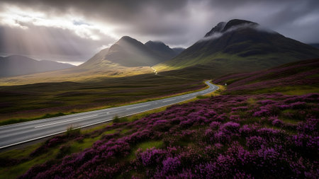A scenic road winds through the majestic scottish highlands adorned with vibrant purple heather under a dramatic sky