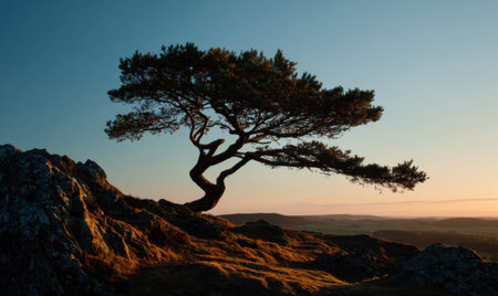 A solitary pine tree stands on a rocky outcrop overlooking a serene valley in the Scottish Highlands during the golden hour