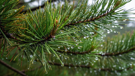 This image showcases a close-up of a pine branch, highlighting its green needles and the water droplets clinging to them. The composition emphasizes natural textures, possibly suggesting a damp environment, captured with shallow depth of field. This could be useful for editorial content or design applications.