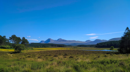 Breathtaking highland landscape featuring rolling hills, a clear blue sky, and soft clouds. Perfect for projects related to nature, travel, and outdoor adventures.