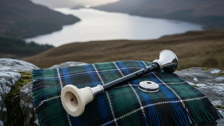 An expansive, cinematic 16:9 wide shot capturing a bagpipe mouthpiece and traditional tartan fabric