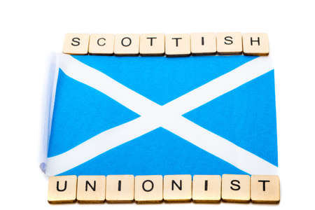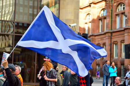 Scottish Saltire flag (St. Andrew's Cross) waving atop of its pole against a blue sky.