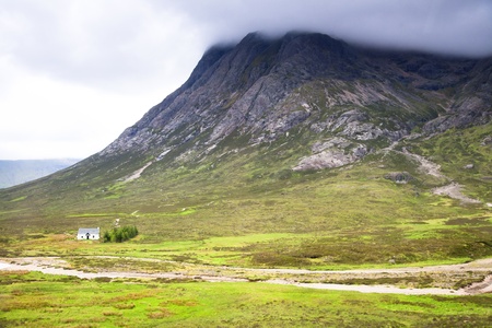 A lonely house under a snow-capped mountain in the Scottish Highland, just off Road A82