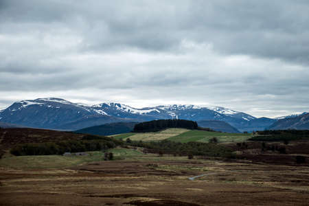 View of the Black Water river crosses the valley, Aultguish Inn Hotel in the middle. The area is not far from Garve village, in Ross-shire, Highland Council area of Scotland