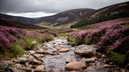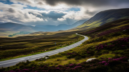 Winding road through the scenic scottish highlands with vibrant purple heather