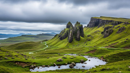 Isle of Skye landscape with lake and mountains. 3D Rendering