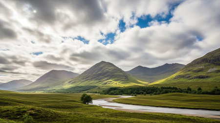 The sun is shining on the green valley of the Glencoe mountains in the Scottish highlands in July