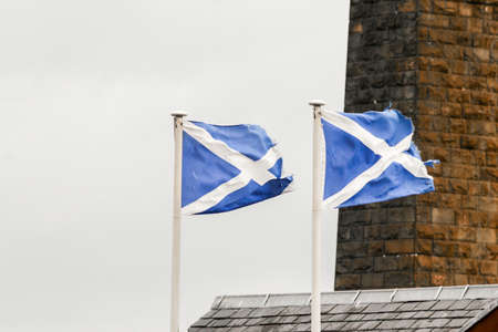 South Queensferry, Scotland. Two flags of Scotland waving in front of one of the pillars of the Forth Rail Bridge