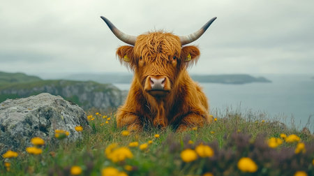 Majestic Highland Cow Grazing on Lush Green Pastures Under Overcast Skies in Scenic Highlands