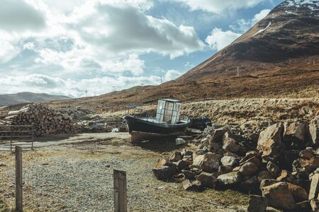 An old fishing boat has been displaced from the nearest lake in Scotland and now live out its days on the backyard