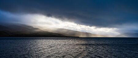 Mountains peaks under the dark storm sky. Dramatic clouds. Jura island, Inner Hebrides, Scotland, UK. Atmospheric landscape. Panoramic view