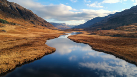 This breathtaking highland scene captures a tranquil river flowing through golden grasslands, framed by majestic mountains under a soft cloudy sky. Perfect for nature enthusiasts.