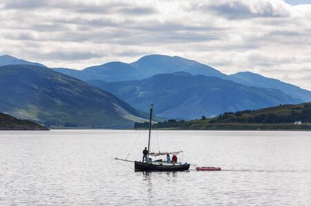 Ullapool, Scotland - August 15, 2010: People in a small sailing boat in front of the small village of Ullapool in the Highlands in Scotland, United Kingdom