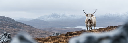 A close-up shot presents a Highland cow against a blurred winter background. The cow is distinguished by its long, brown fur and impressive horns. The scene showcases a natural, outdoor environment possibly suitable for various commercial or editorial applications such as articles or advertising campaigns.