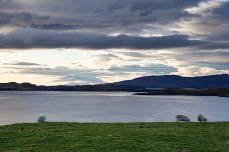 Sheep pasturing on the banks of fjords of Lake Bracadale at sunset, Skye, Scotland, UK