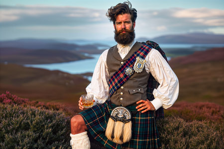 An AI illustration of a man wearing traditional Scottish attire on the side of a rugged mountain