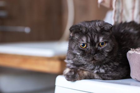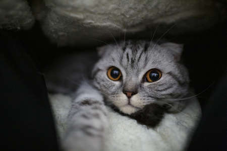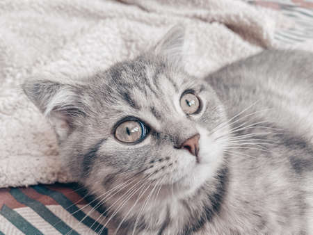 Beautiful pet is playfully looking. Scottish fold cat plays in the afternoon. Stock photo background