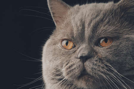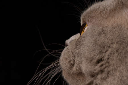 Closeup Portrait of Scottish Cat on black Background in Profile. Eyes macro