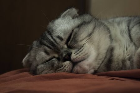 A gray cat of Scottish breed sleeps on a sofa.