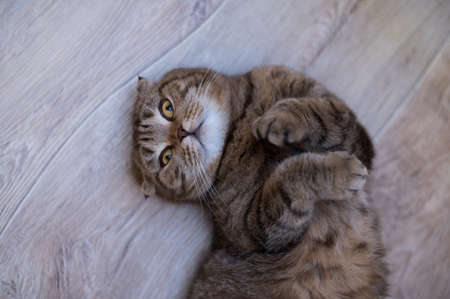 Adult Scottish Fold funny cat lies on the wooden floor