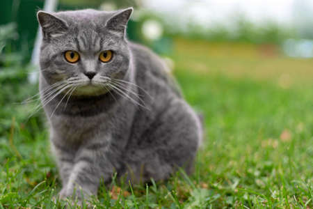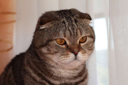 Scottish fold cat of gray color. Portrait of a pensive cat. Pet.