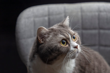Studio portrait British Cat on gray chair with yellow eyes. Selective focus.