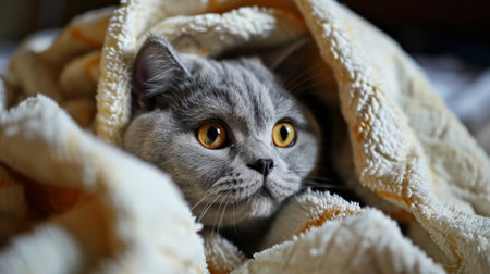 Curious Gray Cat Peeking Out From Under a Cozy Blanket