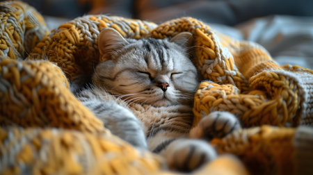 Cute cat sleeping under warm knitted plaid, closeup