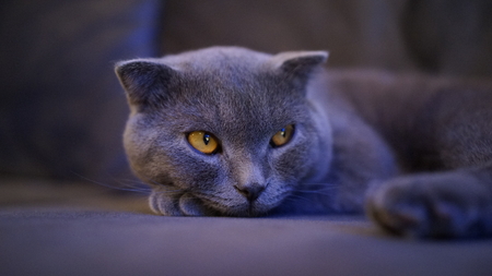 Portrait of a gray scottish fold cat with yellow eyes