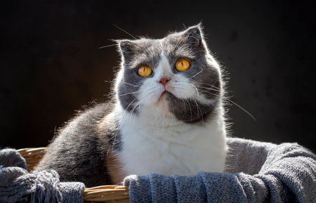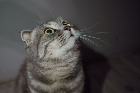 Close up of adorable scottish straight cat on dark background