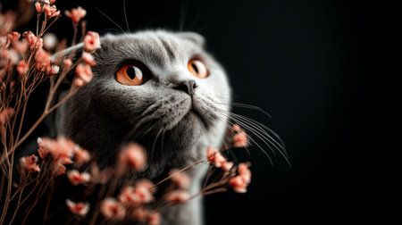 A gray Scottish fold cat with small ears, with orange eyes, with pale pink dry flowers on its body, against a black background,