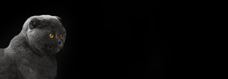 Scottish fold cat in the studio, portrait of animal on a black isolated background, banner with copy space photo