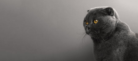Inspiring portrait of animal in studio, scottish fold cat banner on a white silver background, copy space photo
