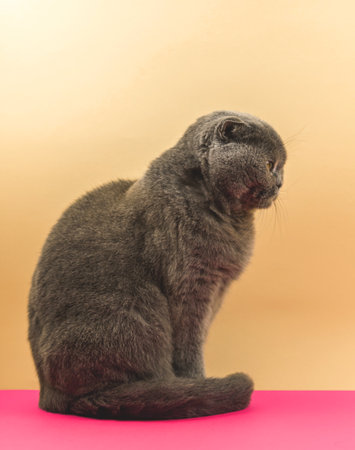 Beautiful and smart cat of the Scottish fold breed on a gray background, toned