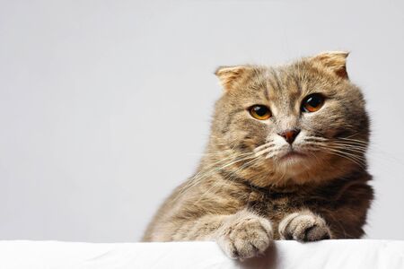 Scottish fold cat. Portrait of a cat with a variegated color with a copy-space.
