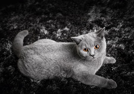 Adorable cat with ginger orange eyes lying on black and white carpet. The British Shorthair pedigreed kitten