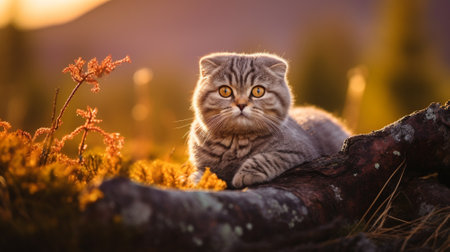 Scottish Fold cat perched on a mossy stone wall in the Scottish Highlands, misty mountains and heather fields in background