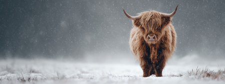 A Highland cow stands in a snowy environment. The animal, with its shaggy brown fur and horns, is centered in the frame. The overall composition includes a soft, diffused light, suggestive of a winter day. This image is suitable for various commercial uses, including advertising and editorial content.