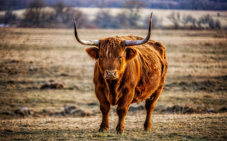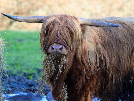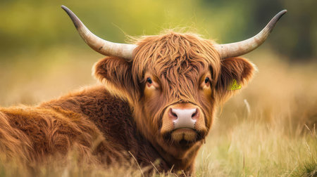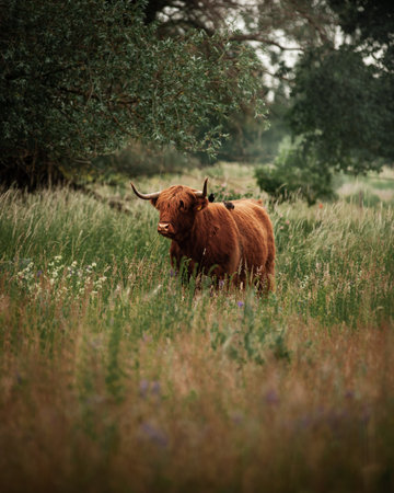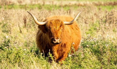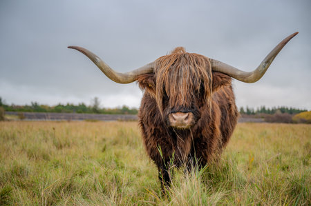 Majestic highland cow standing on a grassy field with its long horns and furry coat