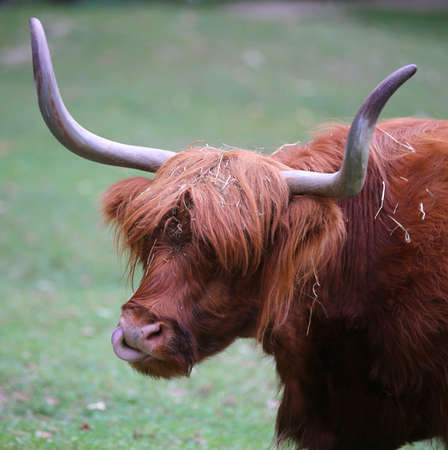 Highland cattle cow portrait on green grassland detail. Bos taurus. Face close-up of one domesticated livestock with horns and brown wavy woolly fur on a rural grazing. Eco pollution. Selective focus.