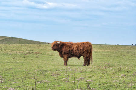 Scottish highland cow grazing in a meadow in Scotland.