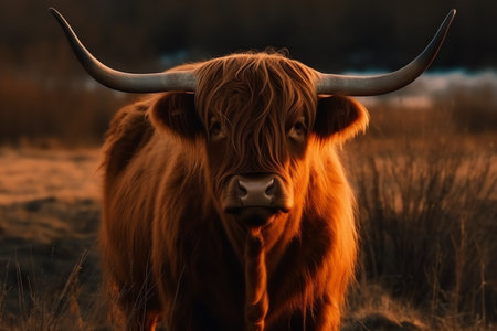 A majestic Highland cow stands proudly in a Scottish field, its shaggy coat illuminated by the warm, golden light of a breathtaking sunset. This iconic symbol of the Highlands gazes forward, embodying the wild, untamed spirit and serene beauty of the rural landscape.