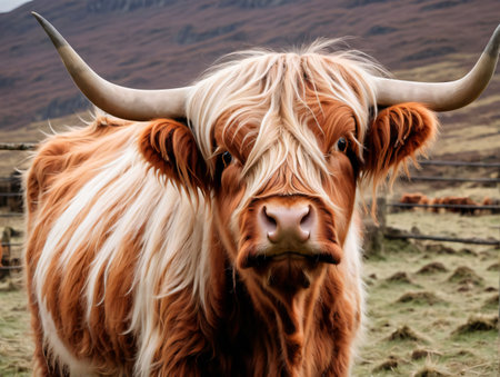 A Scottish Highland Cow covered landscape in the highlands of Scotland