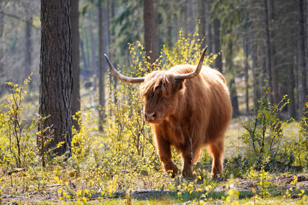 A photo of a bos taurus taurus in a forest in Scottish highland