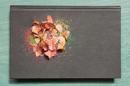 Multicolored pencil shavings in chaotic order on yellow color background.