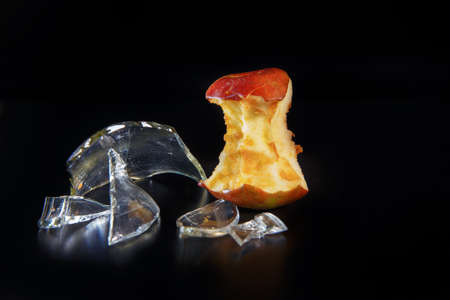 Apple core and shards of glass on a black background with reflection. Ecology and waste recycling concept.