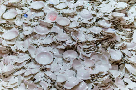 Pieces of shattered dishes. Splinters and Fragments of the broken white ware on a floor. Metaphor of a family quarrel. Broken Plate on brown Background