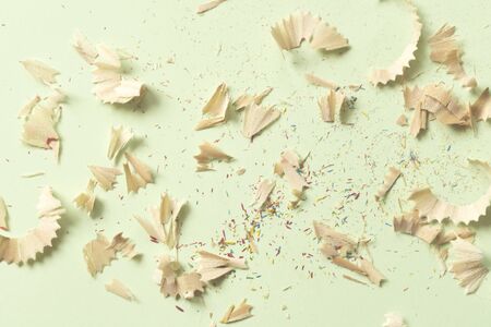 Sawdust from a sharpened colored pencils on the white background. top view. copyspace. Banner. art concept. Drawing hobby. template. mockup design. isolated object. Curly wooden trash. messy texture.